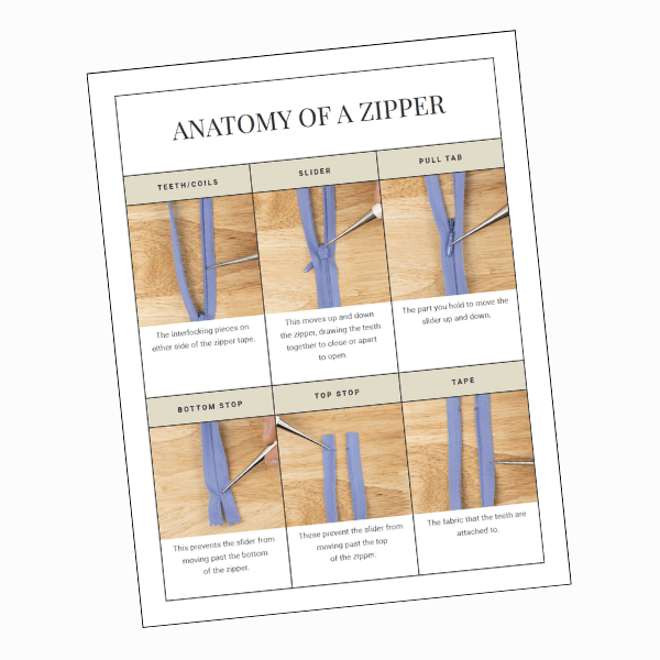 - A downloadable guide to all the parts of a zipper for quick reference.