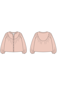 If you want to add some simple drama to your wardrobe, sew this blouse. Aims is a romantic oversized button-up blouse with raglan sleeves, and front and back gathers on the lined, curved yoke. It features a band collar, elastic at the sleeve hem, and 3/8" (10 mm) buttons down the front.
