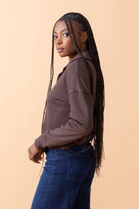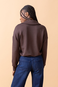 The Cove Sweater offers a stylish and cozy design perfect for layering. With its relaxed fit, dropped shoulders, this cropped sweater exudes effortless and cool style. The neck placket and rolled collar adds a polished touch, while the fitted hem band and sleeve cuffs provide a clean, finished look. Pair Cove with the Palmer pants to create a chic loungewear set or with your favorite jeans for a more elevated take on sweatshirt and jeans.