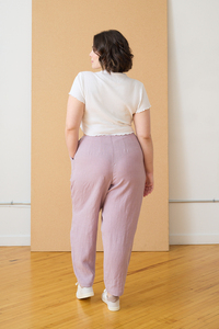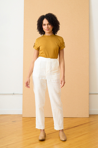 Medium weight woven fabrics such as cotton twill, chino, linen, linen blends, denim, and suitings.