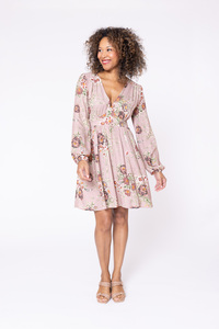 Sew a dress for your next party! Frankie is a woven dress with a memorable silhouette, perfect for florals, jewel tones, or even a little sparkle. This dress has a fitted waist yoke and 6-gore gathered skirt. The V-neck is finished with a facing and lined yoke that gathers slightly below the shoulders. The sleeves are full length with elastic at the hem, and it keeps a sleek fit with an invisible zipper at the side seam.