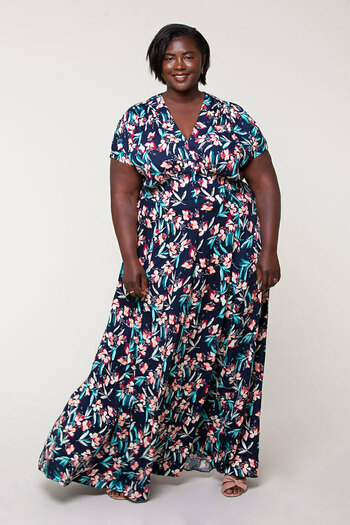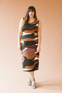 Daryn is wearing a large Lane dress graded to an extra-large at the waist and hips. Her measurements are 42", 35.25", 46.75".