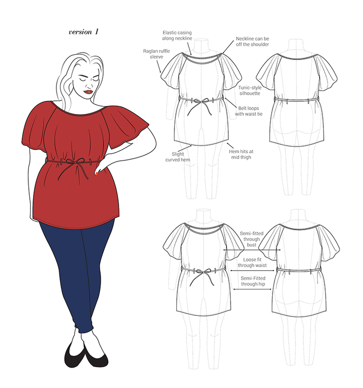 Version 1 is a tunic-length top and version 2 is a blouse-length top that can be paired easily with pants or skirts.