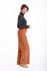Felicia is wearing the Noah trousers in a size 8 with the hip reduced 1/2". Her measurements are waist: 29" (73.7 cm), hip: 38 1/2" (97.8 cm), and she is 5' 8" (172.75 cm) tall.