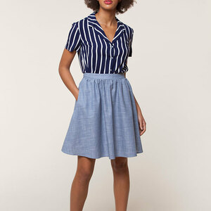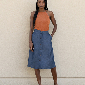 Leonora is a chic skirt with all of the traditional features of denim garment construction, including flat felled seams, a classic back yoke, belt loops, and jean hardware.