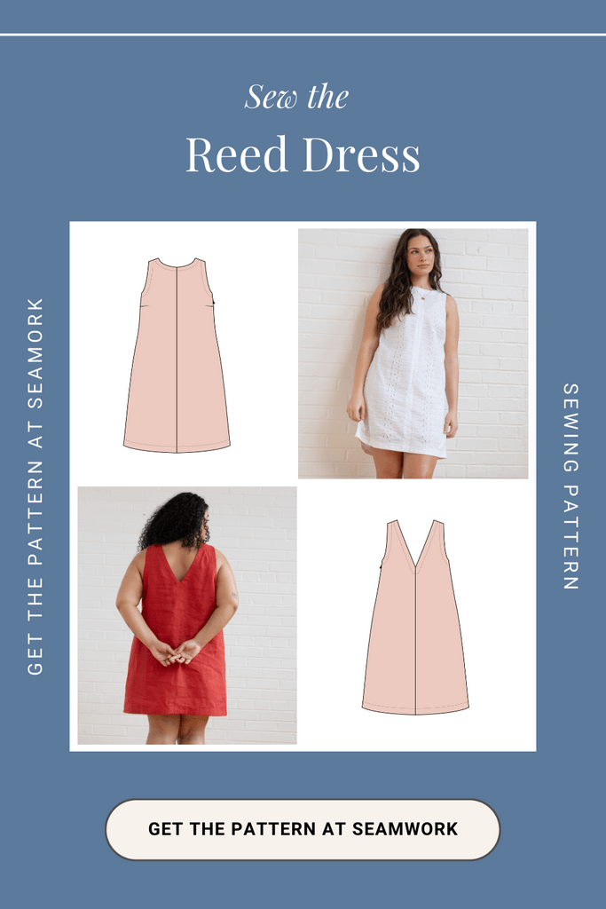 Laurel is wearing the Reed dress in a size 8. We added 1/2" to the length and made a narrow shoulder adjustment. Her measurements are bust: 37" (94 cm), waist: 30" (76.2 cm), hip: 42 1/4" (107.3 cm), and she is 5'9" (175.3 cm) tall.