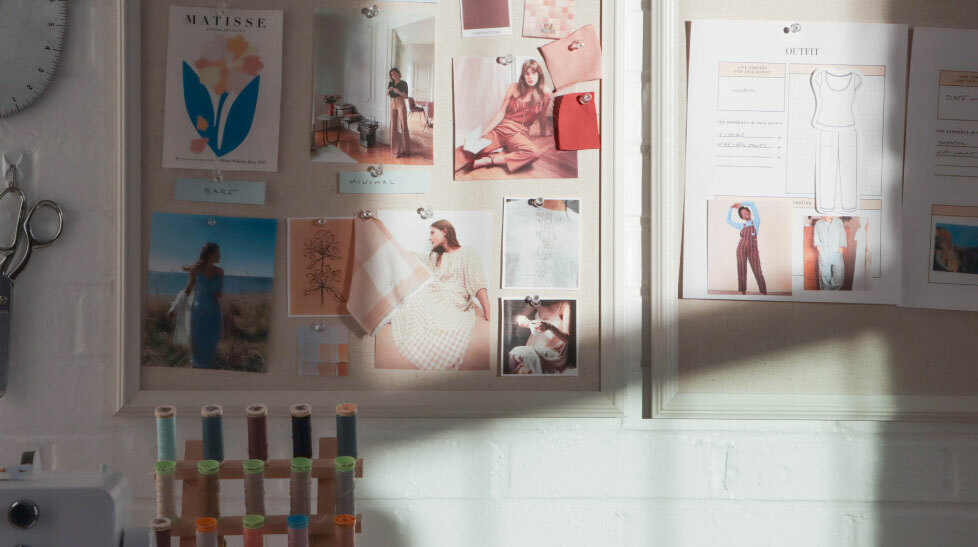 For tip seven, let's talk about creating an inspiration wall or a mood board. I love doing this. You guys know if you've seen that video I mentioned of my sewing shed, I have an inspiration wall in my sewing shed. Again, I'll link to the video tour below if you want to see how I've set it up. If you have wall space, a large corkboard or a framed wire grid is really perfect for pinning things like fabric swatches, sketches, or project ideas. Even if you don't have wall space, you can create a portable mood board in a binder or even a journal. One of our Seamwork ambassadors, Kari, has this wonderful system where she rotates pattern flats on her board every time she finishes a project, and it's such a great visual reminder of her accomplishments. It really keeps her motivated for future projects.