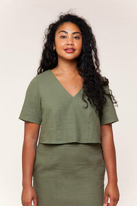 The Adria top is a cropped woven shirt, designed specifically for wearing with high-rise pants and skirts. With a relaxed fit, Adria features front and back waist darts. Use the pattern to create a minimalist chic look or as a blank canvas for inspiring prints and trims.