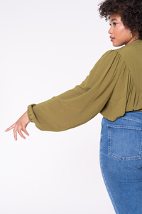 If you want to add some simple drama to your wardrobe, sew this blouse. Aims is a romantic oversized button-up blouse with raglan sleeves, and front and back gathers on the lined, curved yoke. It features a band collar, elastic at the sleeve hem, and 3/8" (10 mm) buttons down the front.