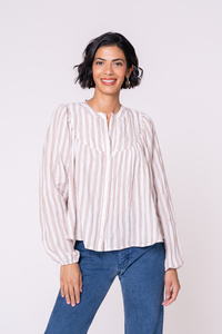 The Aims blouse looks so polished tucked into jeans, shorts, skirts, or your favorite pair of slacks. While you can wear this shirt untucked, you can really highlight the silhouette by tucking it in. Show off those gathers!