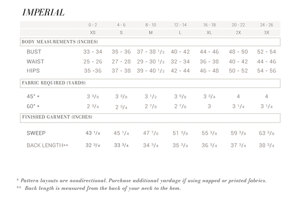 Refer to size chart for amount of fabric needed for your size.