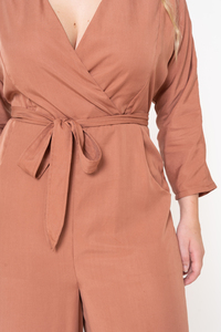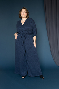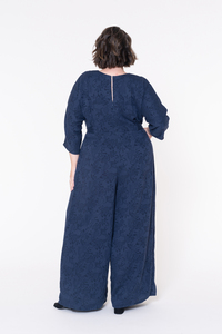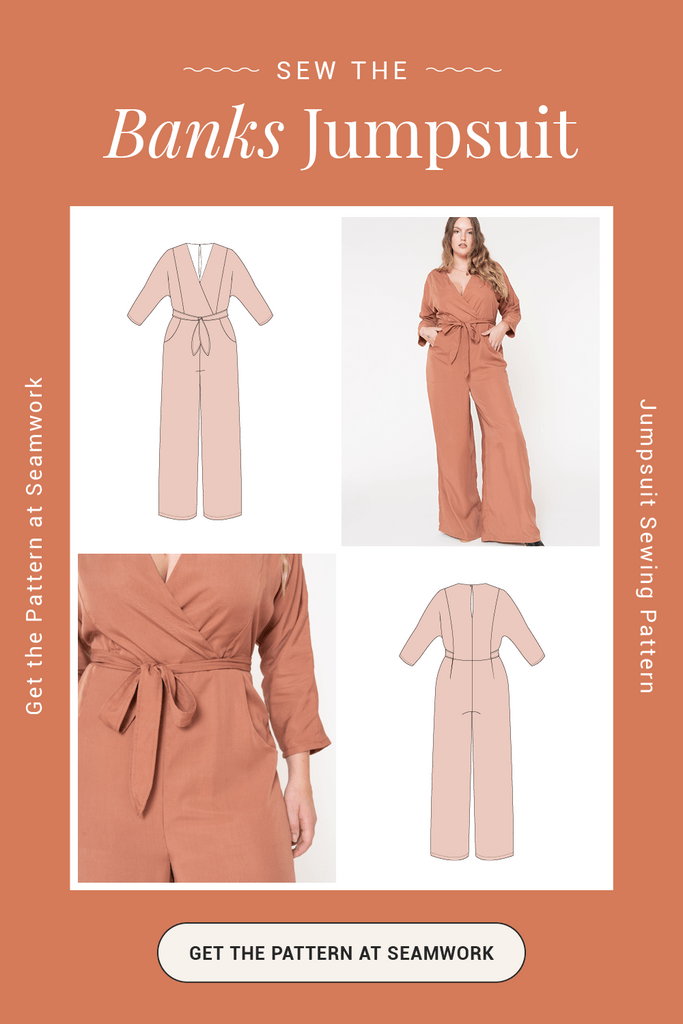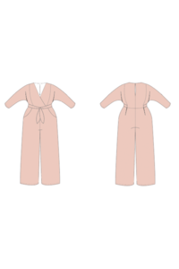 Make a statement with this jumpsuit. Banks is a dramatic dolman sleeve jumpsuit with full-length wide legs. It has a powerful silhouette that is so fun to sew, featuring a surplice bodice with princess seams and lined center and front back panels. This jumpsuit is designed for wovens and it goes on with a zipper and keyhole closure at the back. It also has a shaped waist tie that is sewn directly into the jumpsuit, so it never falls off. There are darts at the back waist and curved in-seam pockets.