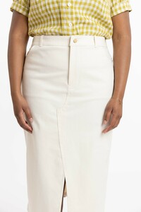 Introducing the Brookes Skirt, a midi-length button-front denim skirt with a classic straight cut. Sitting at the natural waist, it features five belt loops, scoop pockets, and a center front placket with a facing. Designed for stretch denim, the split front hem and mid-calf length offer comfort and mobility, while the back yoke and jean-style pockets add that classic denim charm.