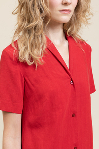 Eden is a classic button-up shirt with a modern touch. It has a slight A-line shape with a V-neckline, short sleeves, and a shawl collar finished with clean facings at the center front. The curved hemline and French darts add just the right amount of shaping. Whether you dress it up or keep it casual, Eden is the kind of versatile shirt you’ll reach for again and again.