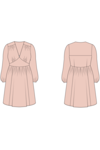 Sew a dress for your next party! Frankie is a woven dress with a memorable silhouette, perfect for florals, jewel tones, or even a little sparkle. This dress has a fitted waist yoke and 6-gore gathered skirt. The V-neck is finished with a facing and lined yoke that gathers slightly below the shoulders. The sleeves are full length with elastic at the hem, and it keeps a sleek fit with an invisible zipper at the side seam.