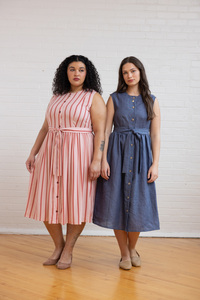 Add a touch of vintage charm to your wardrobe with the Hill dress. This button-front dress features a high, round neckline, slightly extended shoulders, and an A-line skirt. Waist and shoulder darts on both the front and back bodice offer a flattering, tailored fit and the waist tie provides additional definition. The faced neckline and center front add a polished finish, while in-seam pockets offer practicality. Sew this timeless dress in a floral lawn for the ultimate sundress or make it in linen to let the details and silhouette shine.