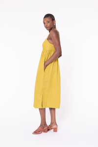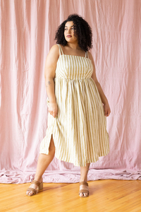 Leighanne is a dreamy empire-waist dress with a gathered skirt. Clustered darts give the lined bodice a tailored appearance, and the skirt has princess seams and is finished with a faced hem and side slits. The double straps on the front add a flirty detail, and the adjustable strap on the back ensures a comfortable fit. This dress closes with an invisible zipper and the skirt has side seam pockets.