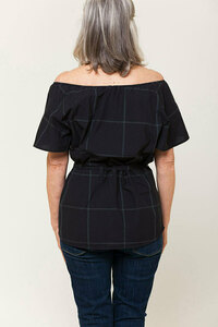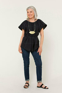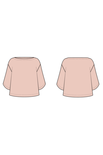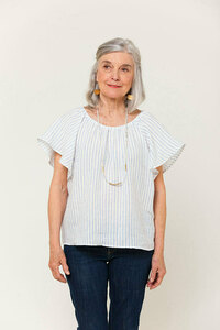 The Loretta top is a pull-over design with both a blouse and tunic option. This easy-to-make top features dramatic flutter sleeves and a convertible off-the-shoulder or scoop neckline.