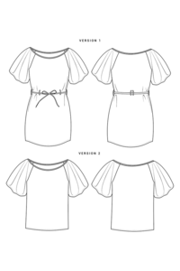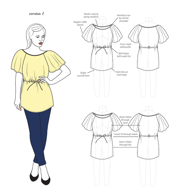 Version 1 is a tunic-length top and version 2 is a blouse-length top that can be paired easily with pants or skirts.