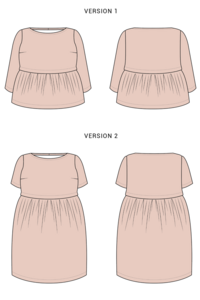 Version 1 is a relaxed top with a gathered peplum, pleated waist detail, and 3/4-length sleeves. Version 2 is a babydoll dress with a gathered skirt that hits below the mid-thigh, pleated waist detail, and short sleeves.
