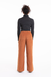 Franki is wearing the Noah trousers in a size 18 from the 12-30 size range. We reduced the inseam length 2 1/2". Her measurements are waist: 39" (99 cm), hip: 50" (127 cm), and she is 5' 6 1/2" (169 cm) tall.