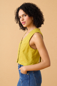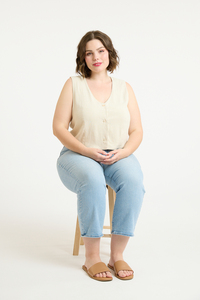 Introducing Otto, a lined vest with a timeless straight cut and modern details. It features a V-neckline, a shaped hem, and three buttons on the center front. Princess seams ensure a comfortable silhouette, and topstitching along the neckline, center front, and hemline adds subtle detail.