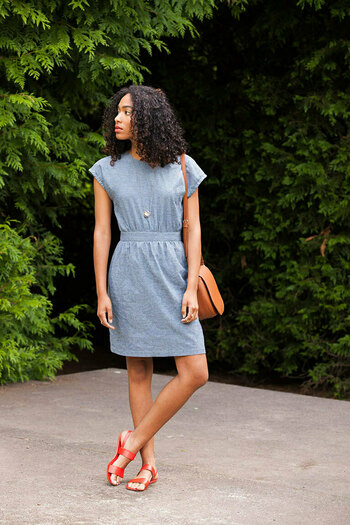Laurel is wearing the Reed dress in a size 8. We added 1/2" to the length and made a narrow shoulder adjustment. Her measurements are bust: 37" (94 cm), waist: 30" (76.2 cm), hip: 42 1/4" (107.3 cm), and she is 5'9" (175.3 cm) tall.