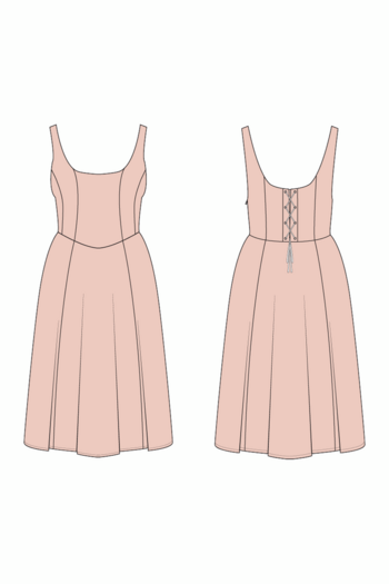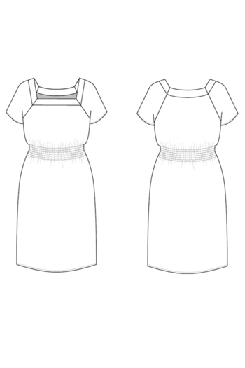 The Reed dress sewing pattern offers a timeless shift silhouette with a flattering carved armhole. It features a high round neckline at the front and a deep V-neckline at the back for an elegant touch. The dress is fitted through the bust with a slight A-line shape through the body, and bust darts provide shaping. An all-in-one facing finishes the neckline and armholes, while a side invisible zipper adds a sleek, polished finish. The hemline ends mid-thigh for a stylish, versatile look.