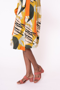 Maya is wearing a size 2 with a broad shoulder adjustment. The bodice was lengthened by 1.5", the skirt by 2.5", and the sleeves by 2.5". Her measurements are 33 1/2”, 26”, 37”, and she is 5’ 10”.