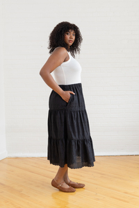 The Yarrow Skirt is the perfect blend of effortless style and skill-building fun. This two-tiered, midi-length skirt features an elastic waistband for all-day comfort and a flattering fit. The pleated hem adds graceful movement and is a great opportunity to practice sewing pleats. Rectangular panels make it ideal for showcasing border prints and eyelet fabric. In-seam pockets at the waist seam add function to this fashionable skirt. Yarrow is an approachable project with polished results—perfect for leveling up your sewing skills in style.